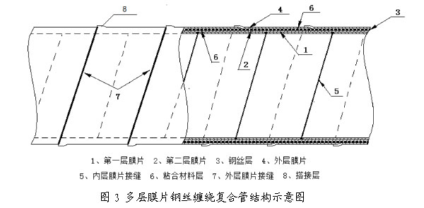 中等口径的中低压管道可由两层膜片同向螺旋缠绕热合而成,中间夹一层镀铜“过塑”高强度碳素弹簧钢丝,其拉伸强度可达1800MPa~2000MPa。每层膜片都先在特种设备上复合一薄层高强度粘合材料。复合管材时外层膜片的中线紧压在内层膜片的接缝上。内层膜片接缝在复合时先用焊枪焊接,外层膜片接缝则采用搭接方式连接。两层膜片敷胶面相向,连同钢丝大面积螺旋缠绕热压粘合,其粘合强度远超普通聚乙烯钢丝缠绕复合管。大口径管道则由3~4层膜片加钢丝复合。管材结构详见图3。